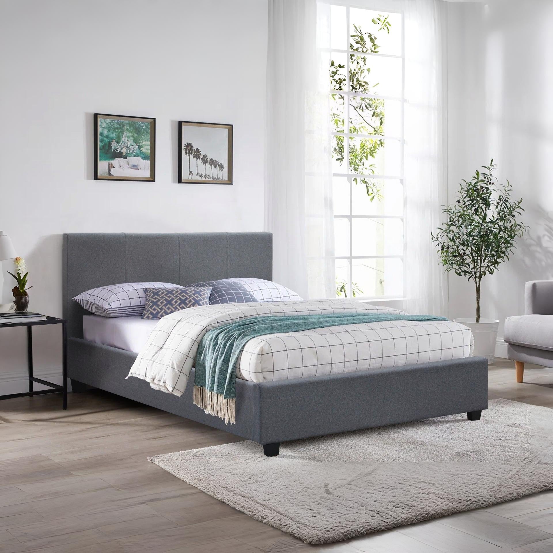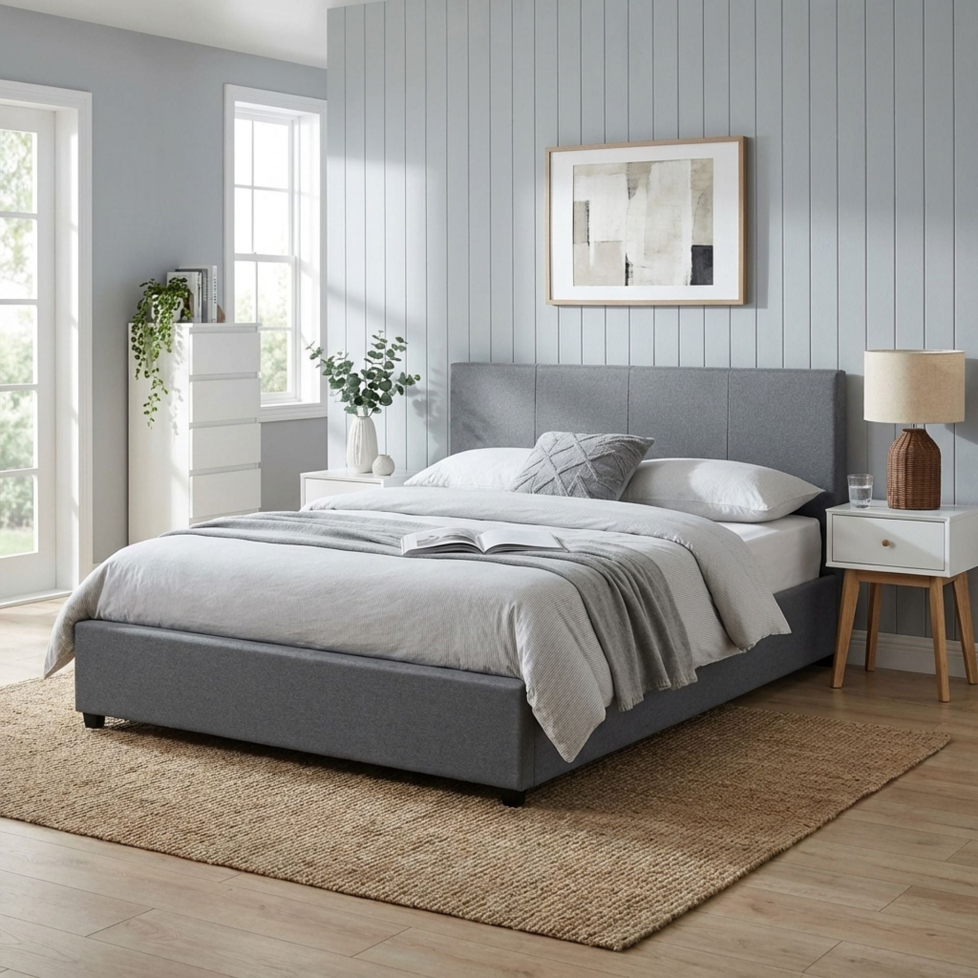 Elevate your bedroom aesthetics with the SHASTA Fabric Slat Bed, a blend of sophistication and style. Its padded headboard, adorned with grey fabric and accentuated by vertical line patterns, introduces an element of luxe and tranquility, ensuring your space feels both opulent and cozy.