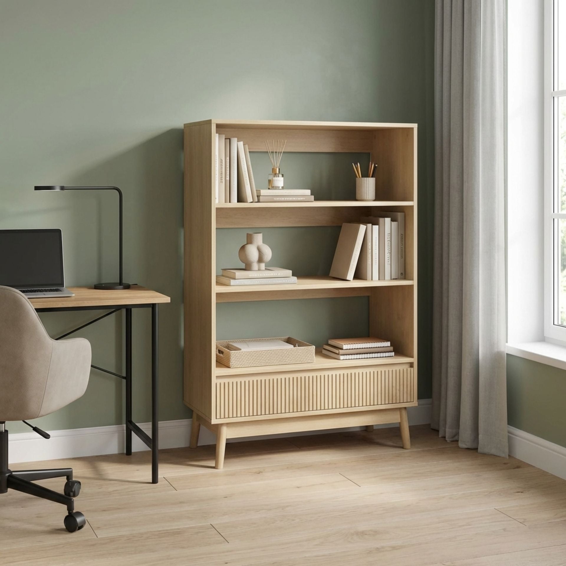 The Shawnee 3 Tier Bookshelf with Drawer in Oak is a perfect addition to your office. Its modern design features open shelving for books or decorative items, combined with a drawer for storage. A sleek design that blends functionality with style.