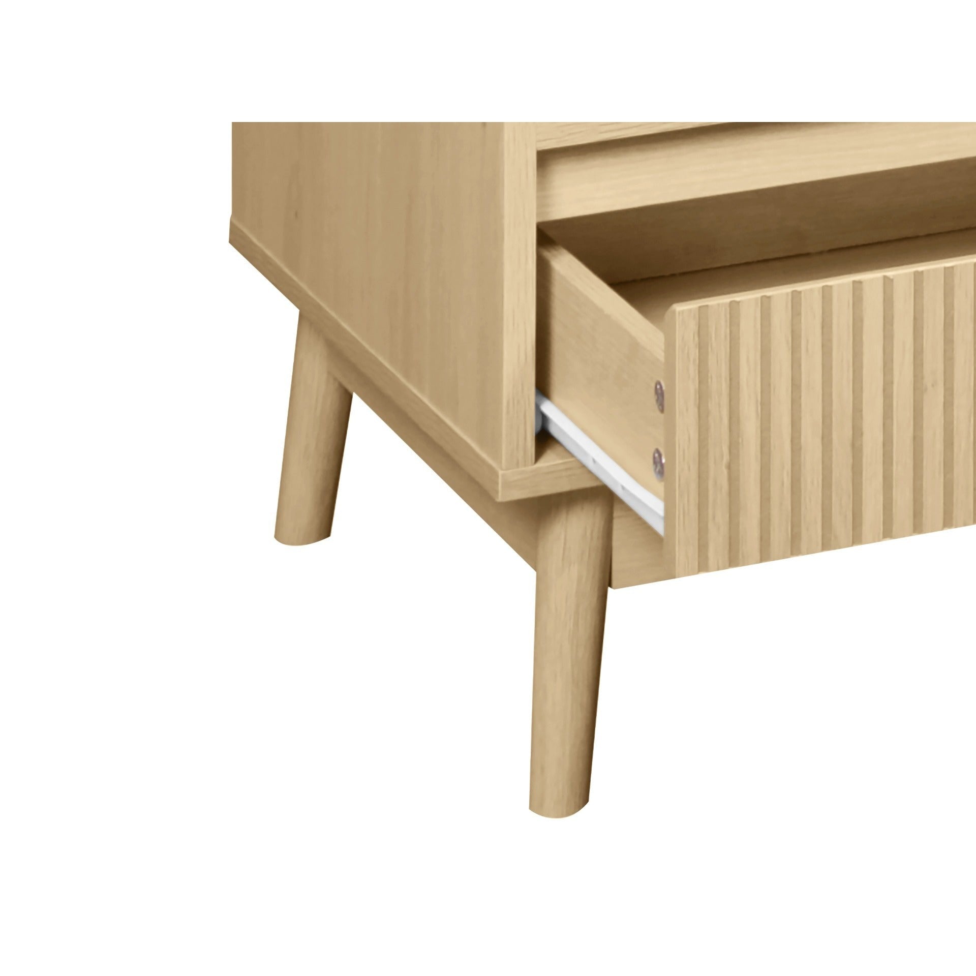 - Material: Particle Board / Linear MDF Panelling / Metal Runner / Solid Pinewood Leg