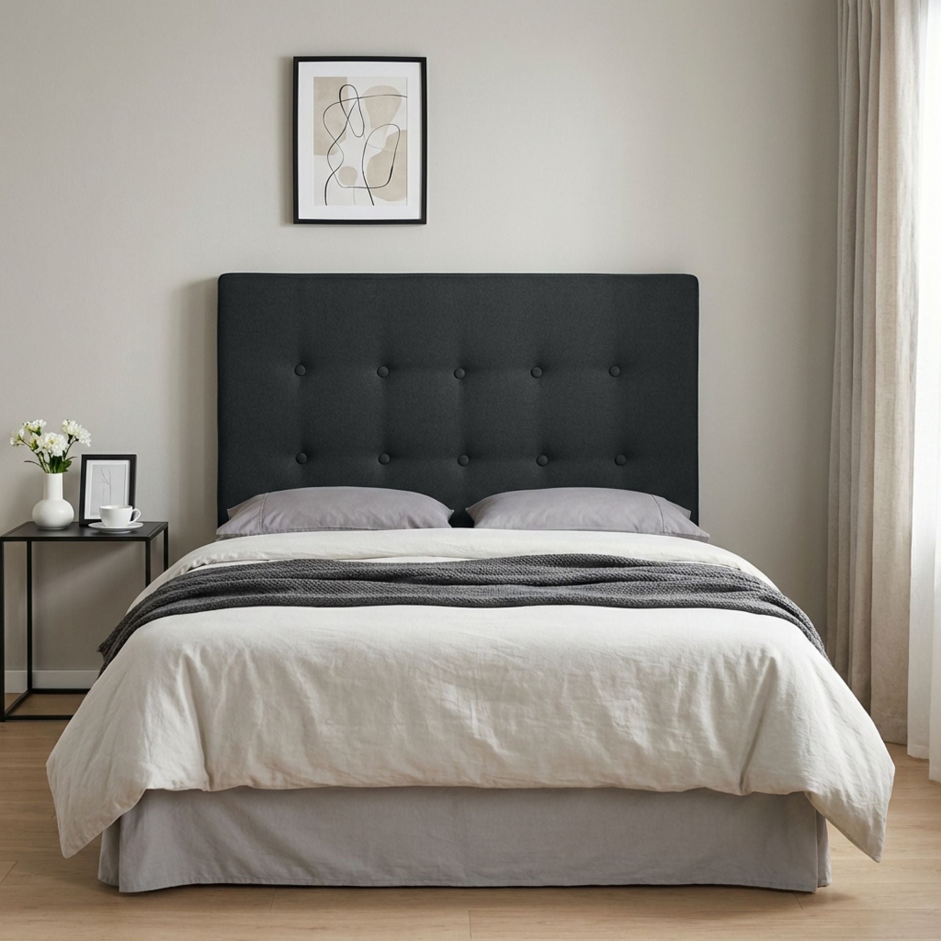 Elegance could be very straight forward and you do not need too much decorations and shapes, just simple clean straight lines as this headboard features. Tufted with simple buttons added touch of adequate decor, padded with comfortable foam and upholstered with polyester fabric to give beautiful linen look. It is not just a beauty with looks but also has quality wooden structure made with solid wood and plywood.