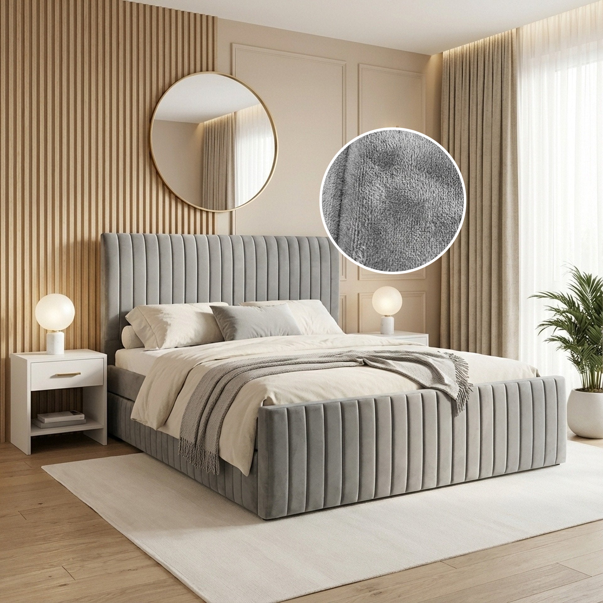 - Material: Velvet fabric upholstery / Metal beams & struts / High density foam padded / Wooden flat slats