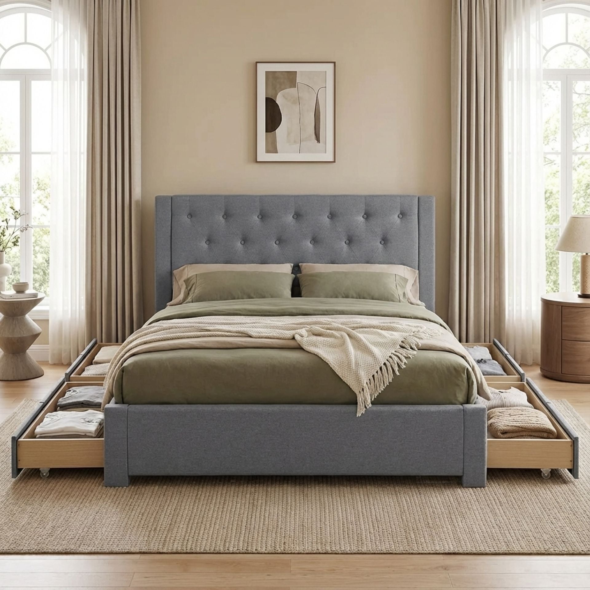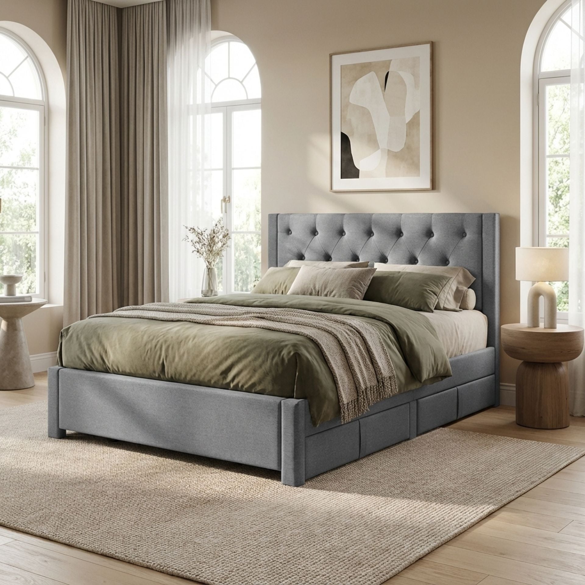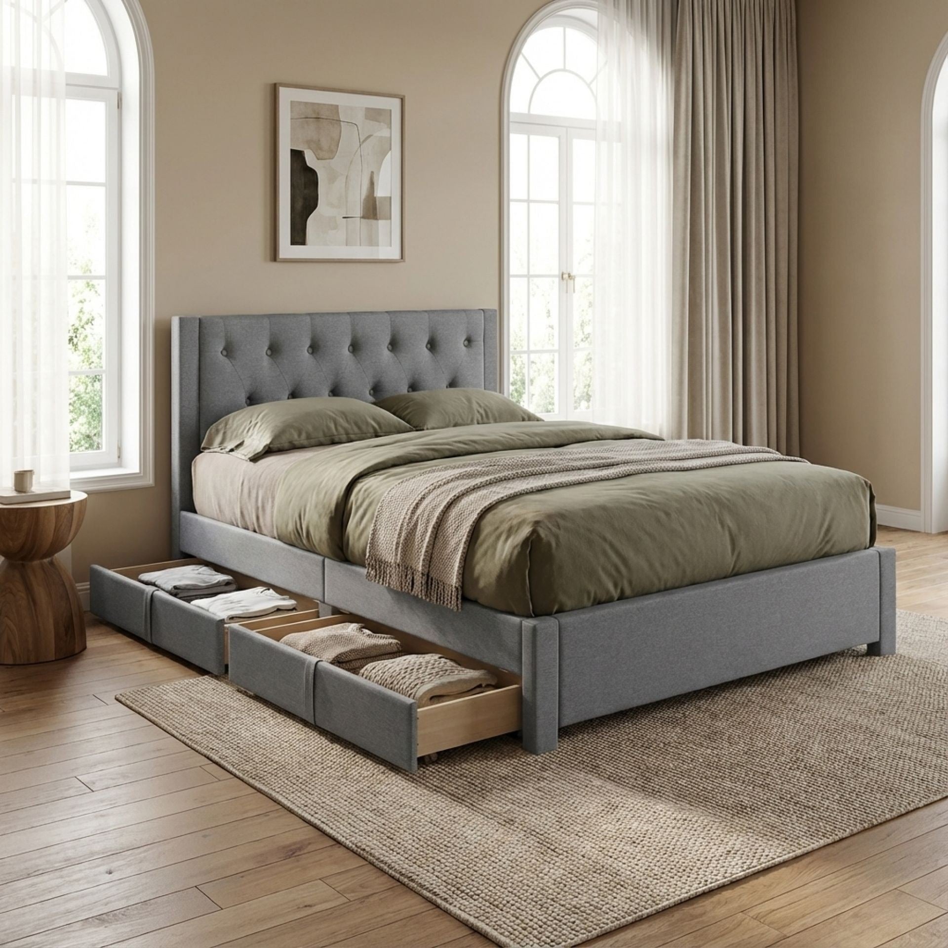 The Thornton Fabric Bed Frame with 4 Drawers in Light Grey is a stylish addition to any bedroom. The breathable, durable linen fabric adds elegance and comfort, while its light grey hue complements various interior designs.