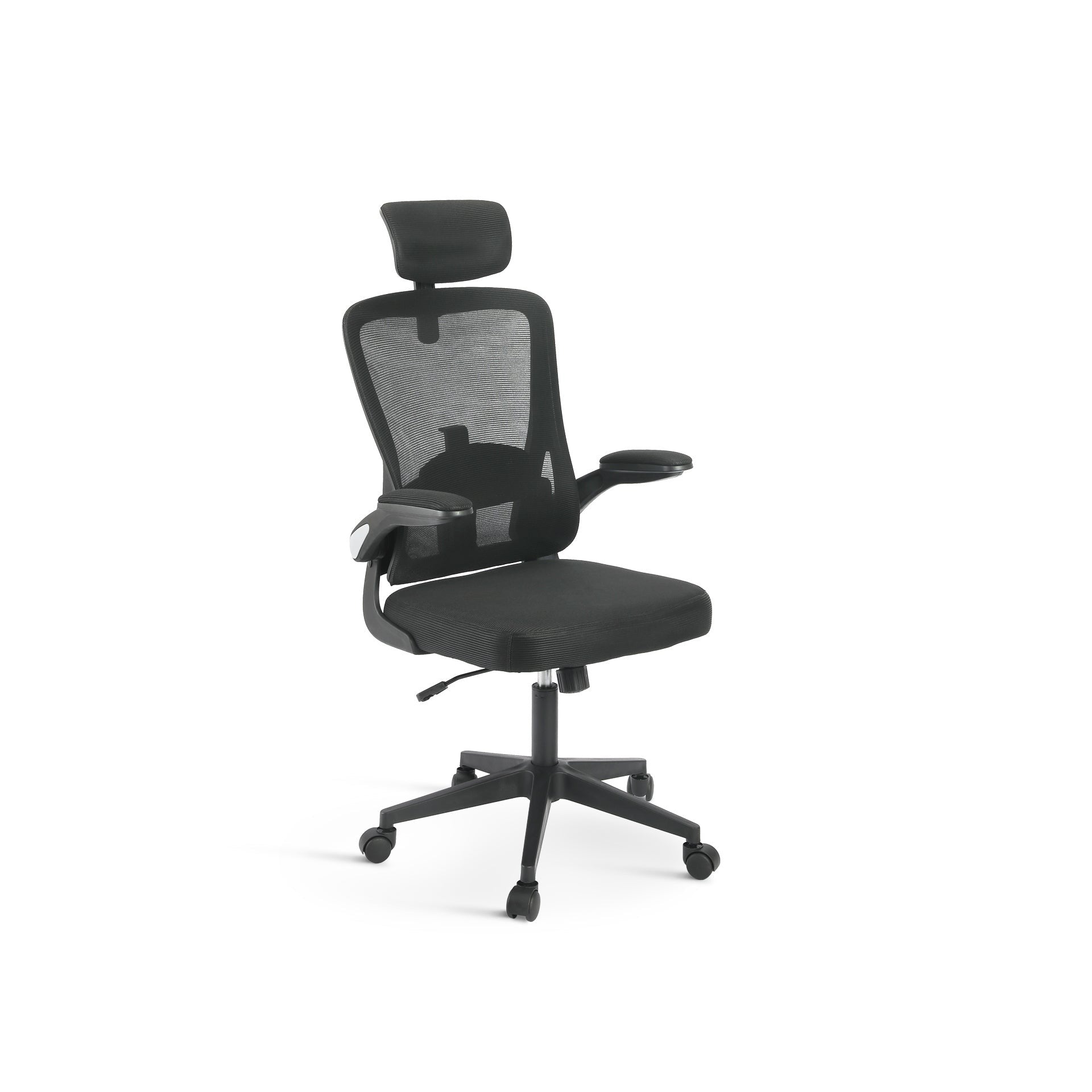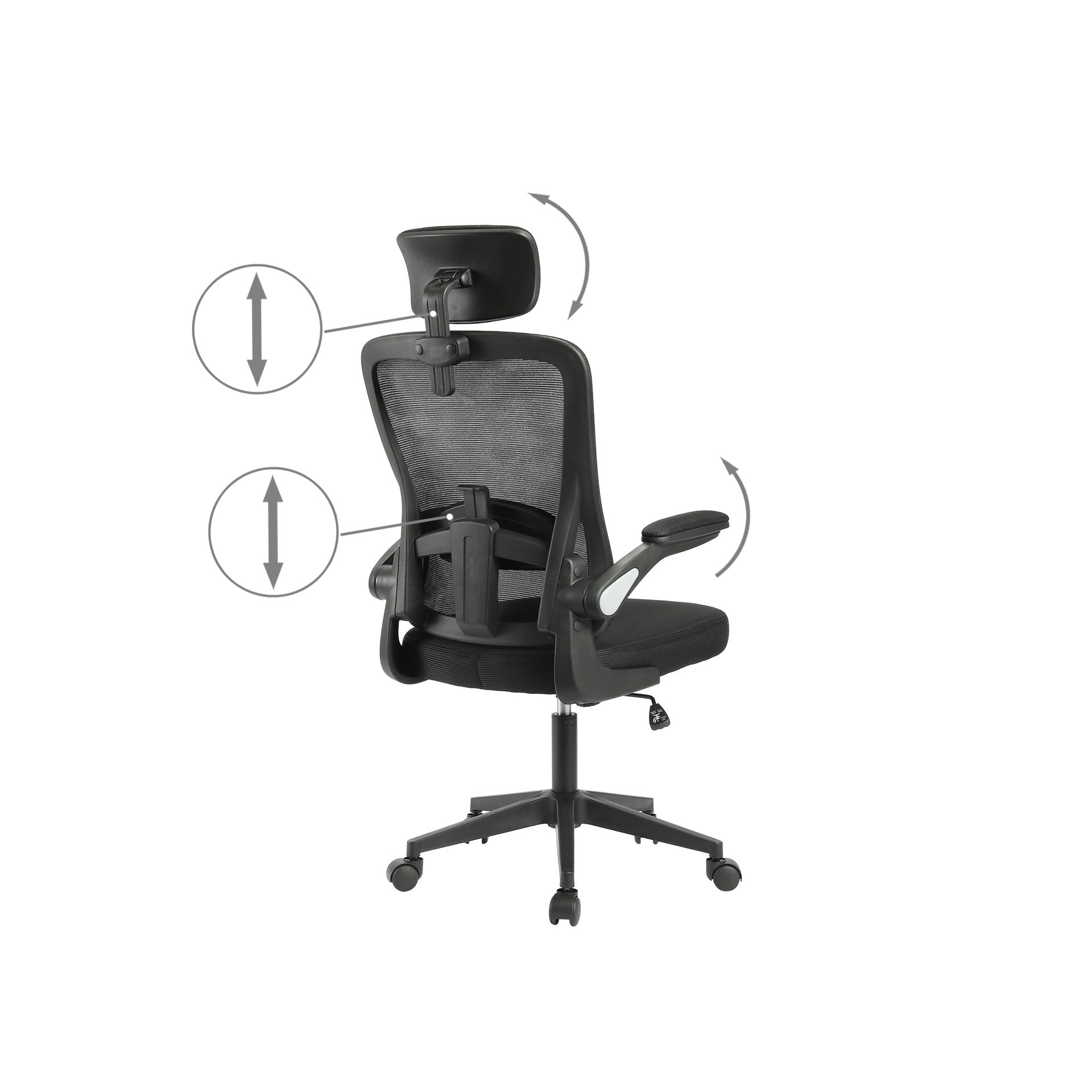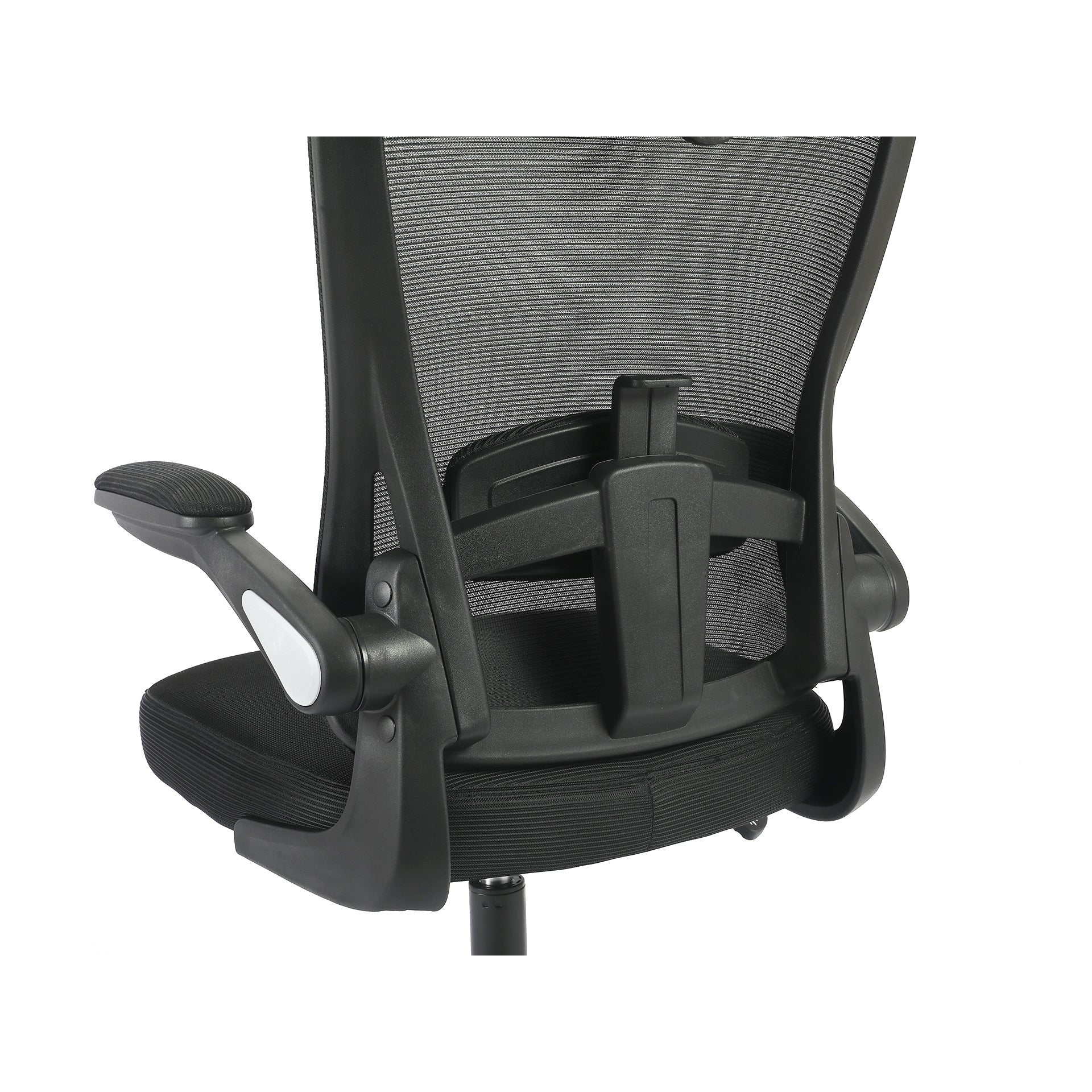 The chair is upholstered in a sleek black mesh fabric that not only looks great but also provides breathability for all-day comfort. The thick and plush seat cushion ensures a comfortable sitting experience, while the flip-up armrests offer additional support and flexibility.