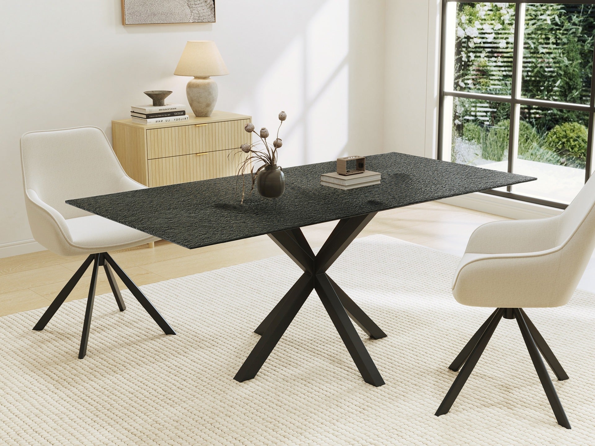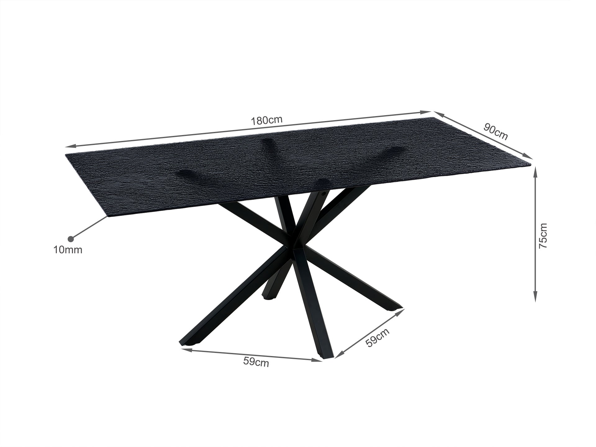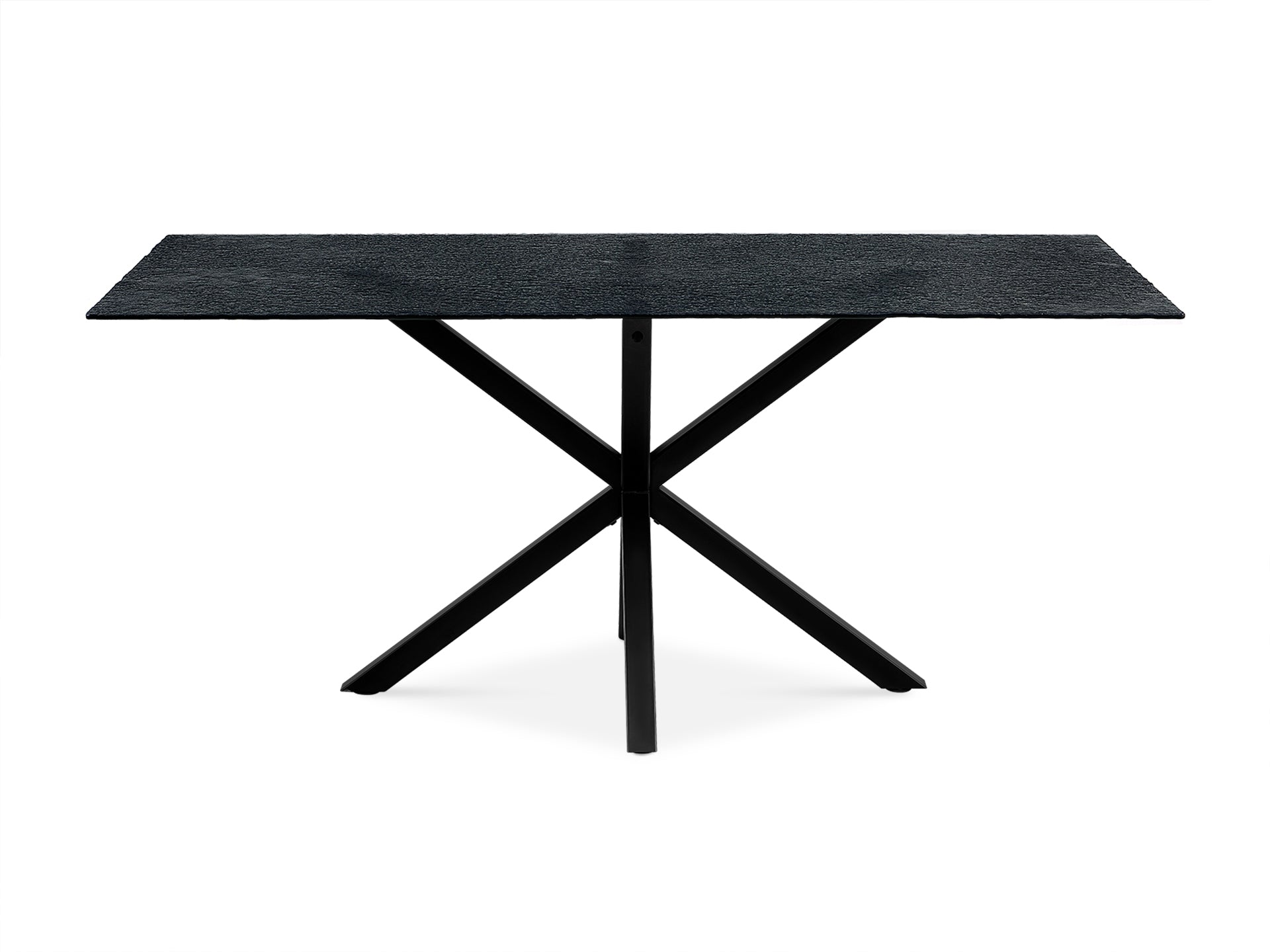 With a unique black fused glass tabletop and bold black powder-coated legs, this dining table combines style and durability. The textured surface resists heat and wear, making it ideal for modern and traditional living spaces.